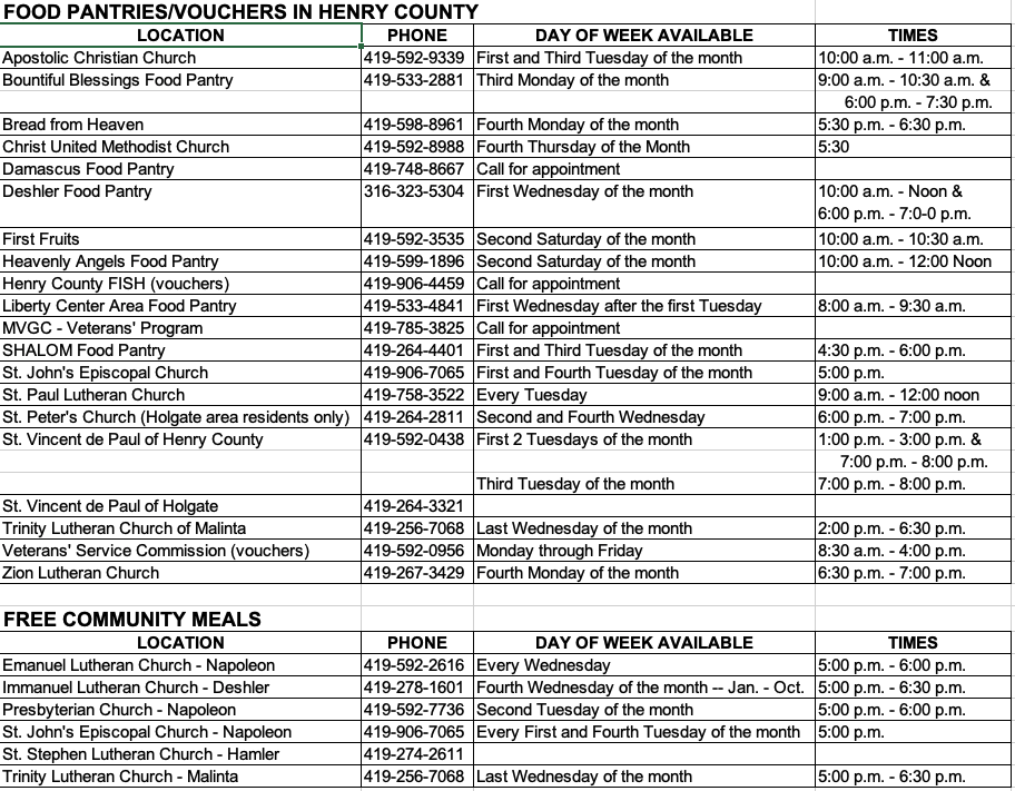 Assistance with rent, utilities, and food: Henry County FISH – 419-906-4459 St. Vincent de Paul – 419-592-0438 Together We Can Make a Difference – 419-579-0199 NW OH Community Action Commission – 419-599-2481